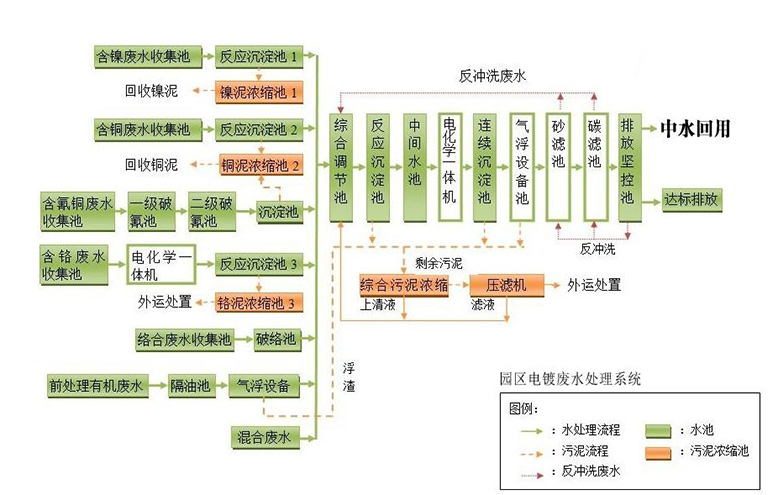 电镀废水处理设备由调节池、加药箱、还原池、中和反应池、pH调节池、絮凝池、斜管沉淀池、厢式压滤机、清水池、气浮反应、活性炭过滤器等组成。