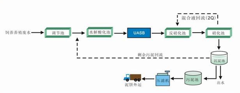 养殖污水具有典型的“三高”特征即有机物浓度高COD高达3000-12000mg/l,氨氮高达800-2200mg/l,悬浮物多SS超标数十倍,色度深,并含有大量的细菌,氨氮、有机磷含量高。可生化性好,冲洗排放时间集中,冲击负荷大。